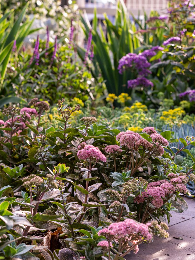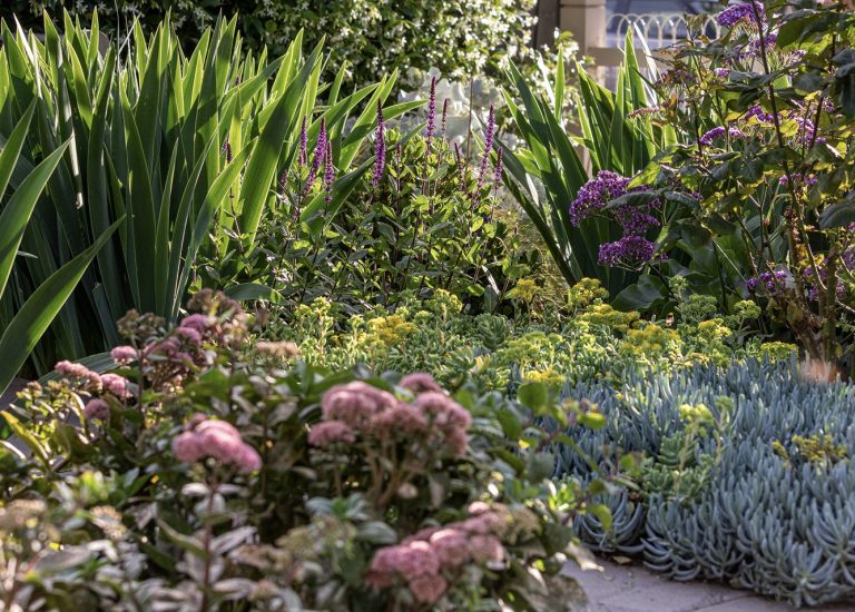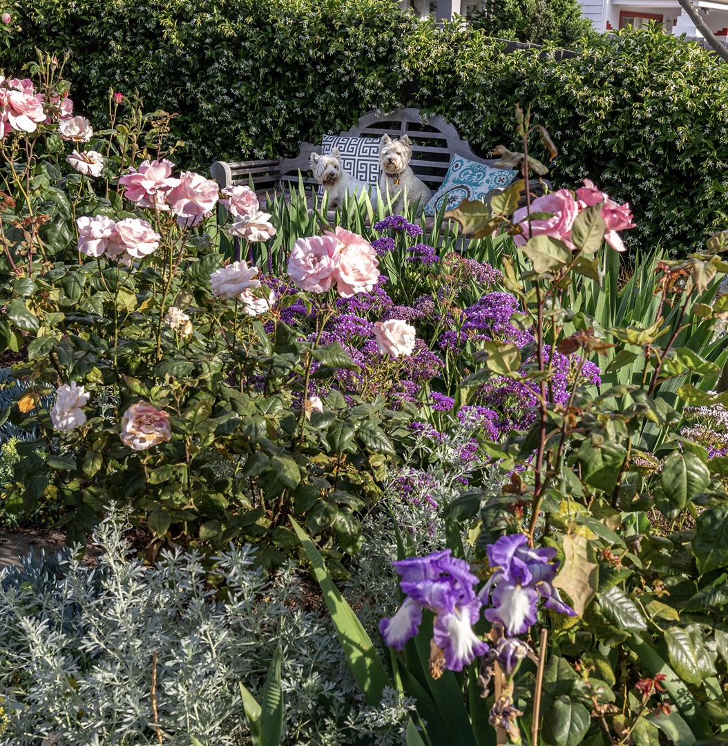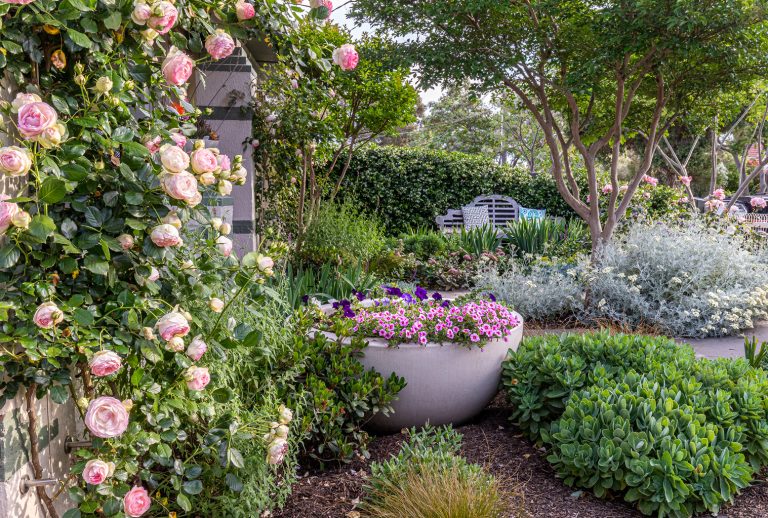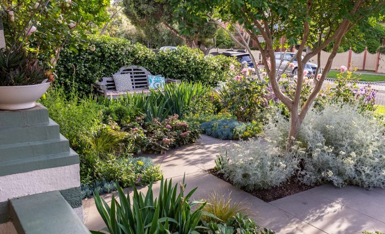 The front yard of this Californian bungalow was inspired by the resilient and seasonal gardens of the Mediterranean, with timeless materials and plants complementing the period architecture. Designed to be layered and bursting with texture, colour and scent, The Highlander pairs generous plantings of iris, rose and perennials with the structure of large-format bluestone pavers. Bathed in sunlight during the day, the garden is a haven to butterflies, bees and native birds. A Lutyens bench offers a welcome spot to enjoy the late afternoon rays. Then, with the arrival of dusk, a clever lighting scheme illuminates the focal trees and creates a gentle ambience.
